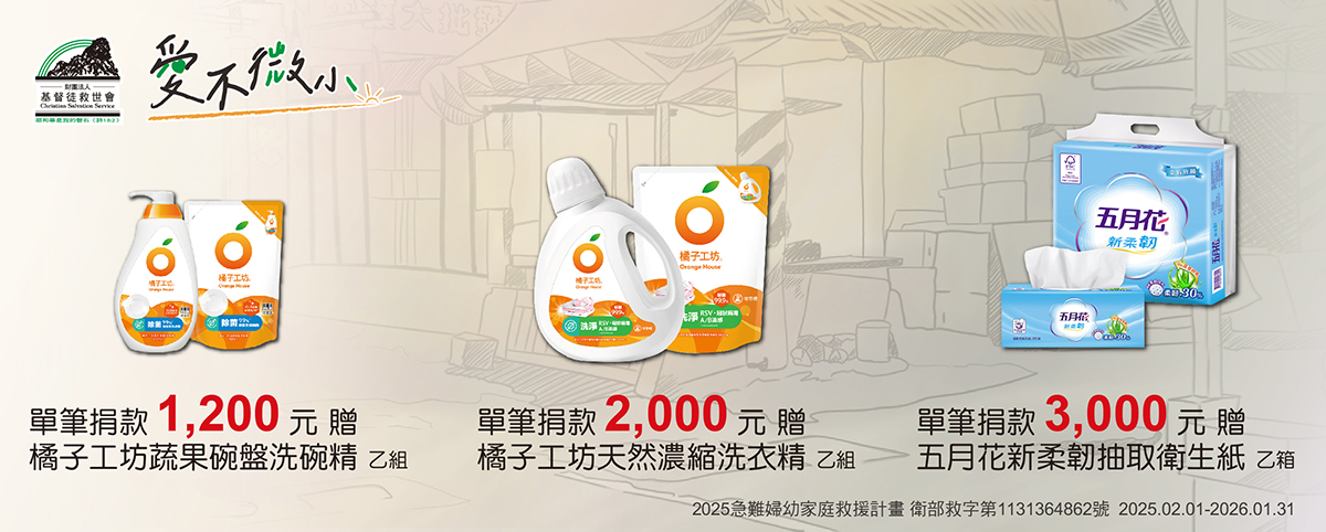 ※若您選擇的定期捐款期數超過本活動期間,尚未到期之捐款將轉為一般捐款,做為救世會推動婦幼家庭服務之會務運作使用;如要停止定期定額捐款,請來信 : donate@csstpe.org.tw,或來電通知 (02)2729-5961,謝謝您的愛心!